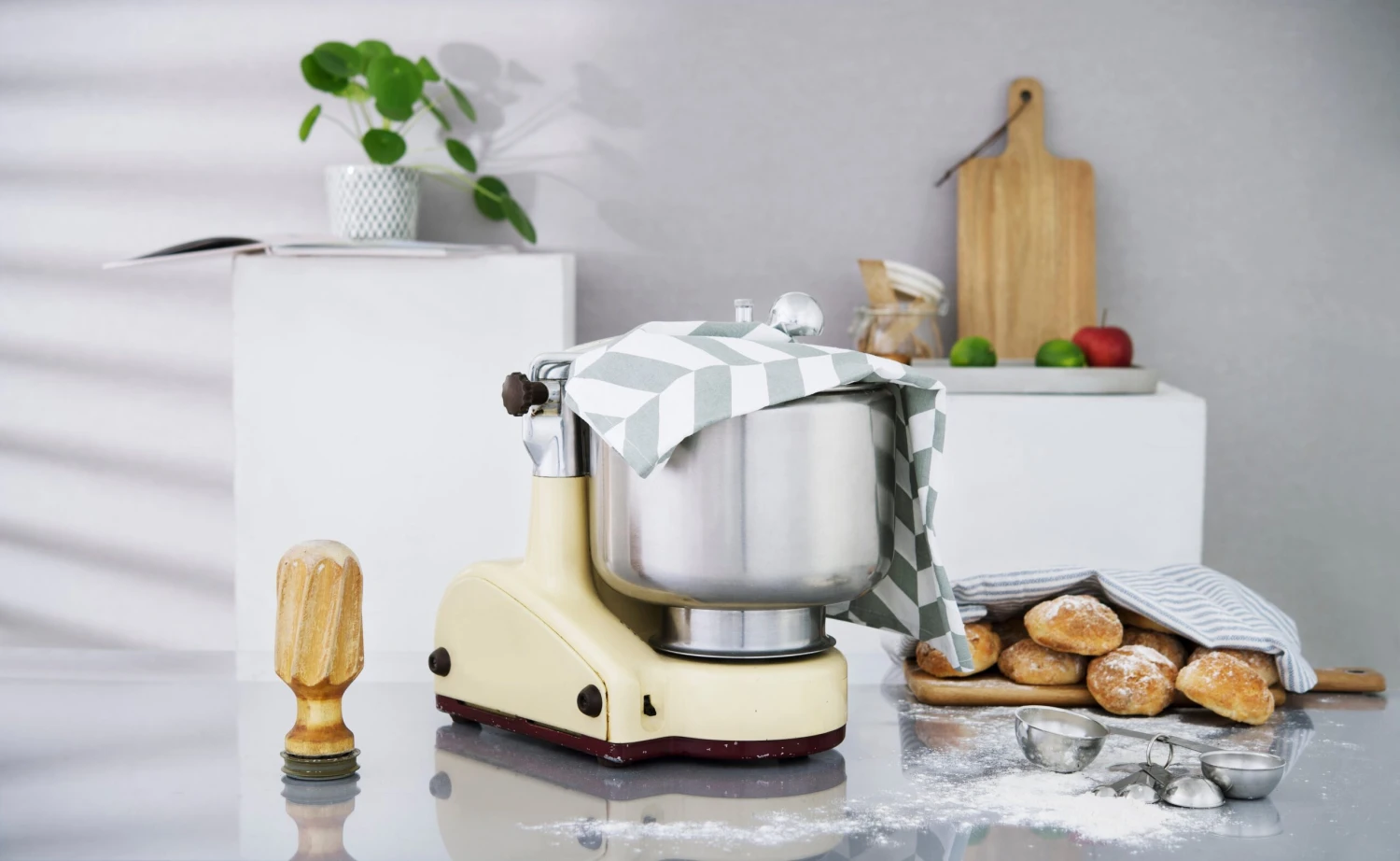 - Mixer may be turned on its side to accommodate a variety of attachments purchased separately. These include a meat grinder, vegetable slicer, blender, citrus press, strainer, grater, pasta discs, flake and grain mills and cookie press.