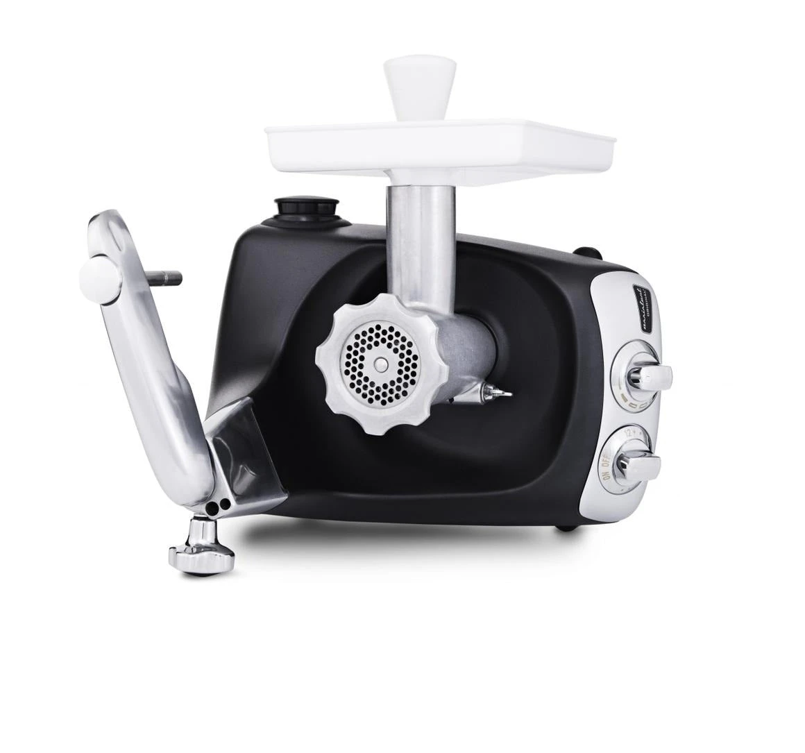 The Meat Mincer Complete features aluminum mincer housing and auger, stainless steel grinding discs in four sizes, 2.5mm, 4.5mm, 6.0mm and 8.0mm, ideal for fine to course grinding; Small (10mm), medium (20mm) and large (25mm) sausage horns. Nut grater attachment for grinding fresh almond flour; Strainer attachment for processing berries, apples and tomatoes into seedless sauces; Cookie extruder for spritz cookies or cheese straws and comes with a 1 year warranty on all parts. All metal pieces are NOT dishwasher safe and should be washed in warm soapy water and towel dried by hand. Grinding discs and knife should be rubbed with oil once they are clean.