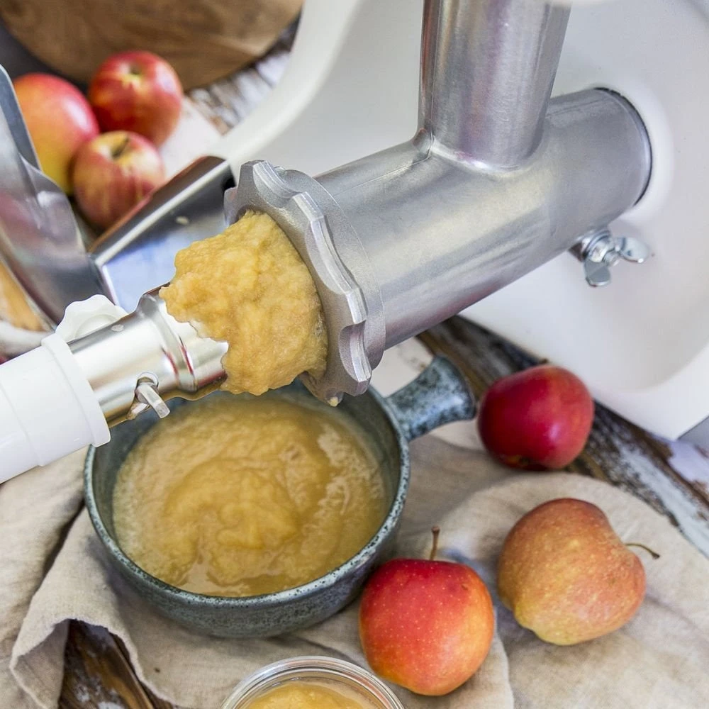 - Includes feeder table, plug, splash guard, sausage horn, strainer, grater, and cookie attachment