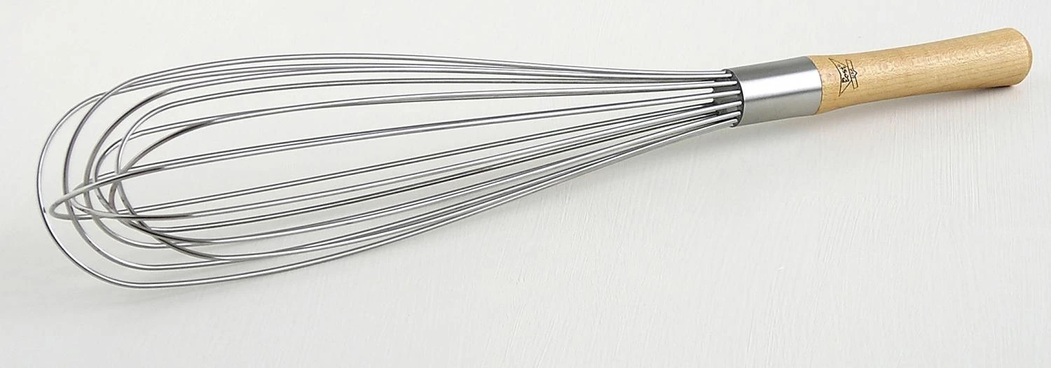 Large size with heavier wire in a stay cool wood handle. This handle provides a firm natural grip, which is completely sealed for sanitary, easy cleaning.