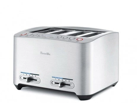 1800-watt 4-slice toaster with intelligent one-touch auto lowering function Push-button controls for toast, a bit more, bagel, defrost, and lift-and-look functions LED panel illuminates according to selected setting on variable browning control Brushed die-cast metal housing; end-of-cycle beep; 1-1/5-inch-wide slots; cord wrap Measures 11-3/4 by 11-3/4 by 7-3/4 inches; 1-year limited warranty.