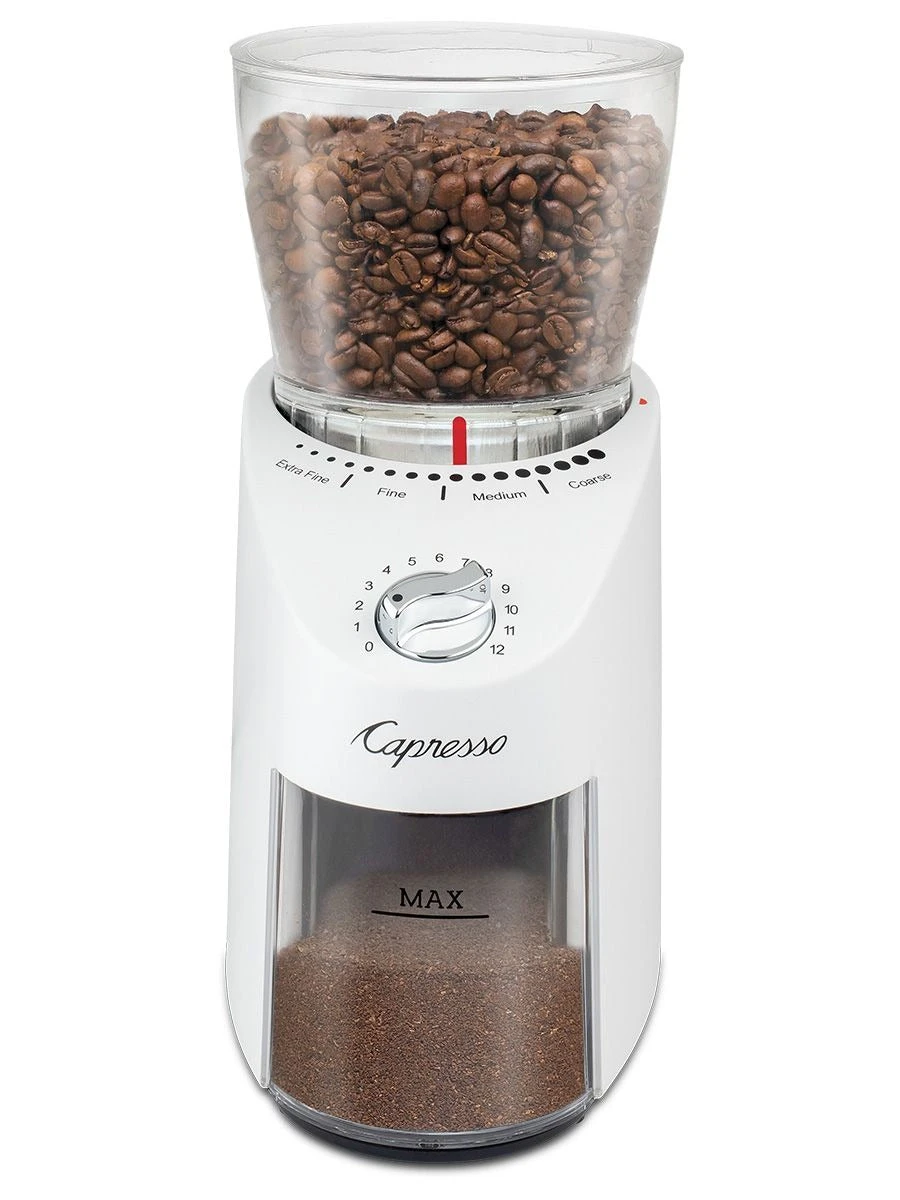 - The Infinity Plus Conical Burr Grinder will only grind when the red indicator on the bean container points to one of the fineness settings. Turn the selector knob and grinding starts instantly.