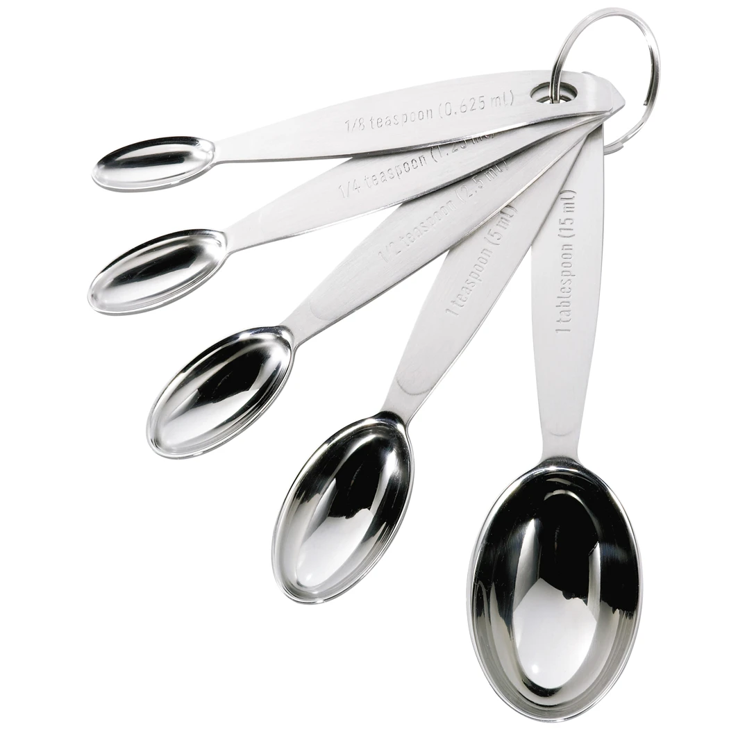 The oval shape of these stainless steel measuring spoons makes it easy to get them into spice jars. The curved handle is designed to let them sit on the counter without tipping over. Set of 5 spoons (1/8, 1/4, 1/2 and 1 teaspoons, plus 1 tablespoon) on a convenient storage ring.QB 21631 021631
