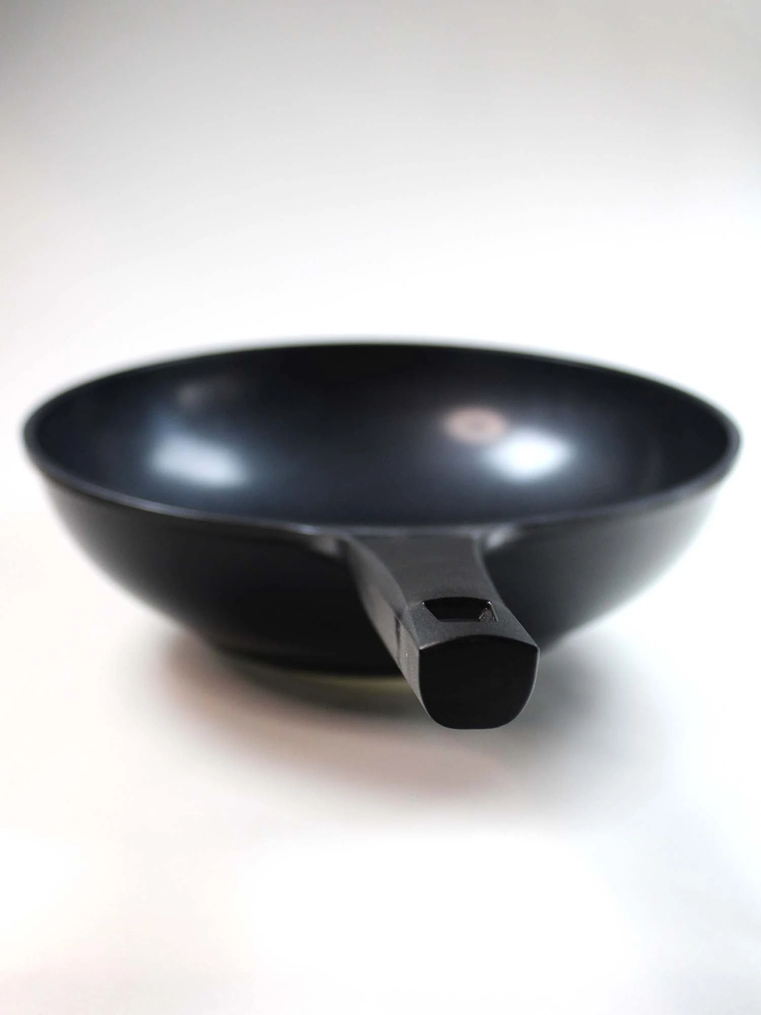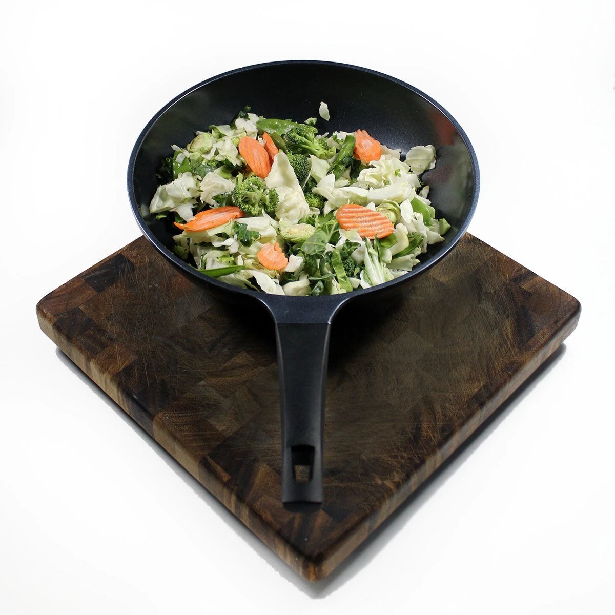 This unique pan offers great versatility as a stir frying and saute pan. It has no awkward, hard-to-reach corners when stirring and whisking.