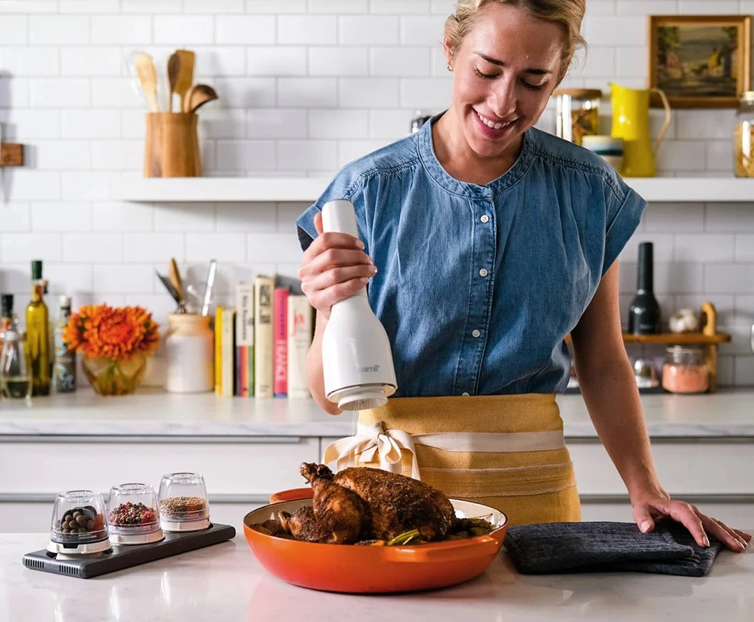 Simply fill a grinding pod with your favorite spice and attach it to the FinaMill. Hold the FinaMill over your food, press the button, and a LED light will illuminate a shower of freshly ground spices. You can operate the FinaMill with just one hand—perfect for multitasking cooks and people with limited mobility. FinaMill grinding pods double as storage for all your spices, and can be swapped in with just a couple clicks. Even the grind size is adjustable; mill dried chiles to a fine grind or coarsely crack black pepper and sea salt.