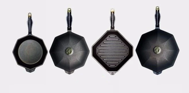 Like the best antique skillets, Finex Cast Iron Skillets have a polished ultra-smooth cook surface that minimizes sticking and cleaning. Unlike your grandparents’ skillet, its distinctive geometric shape is pouring friendly. That means less spills and drips, which makes for less clean up. The ergonomic stainless steel spring handle cools down quickly, so no need for bulky oven mitts or floppy grabbers while you’re cooking. The ribbed helper handle on the front lip makes it easy to lift the pan and transfer it from stovetop to table, and the brass cap makes it easy to hang the pan when your done.