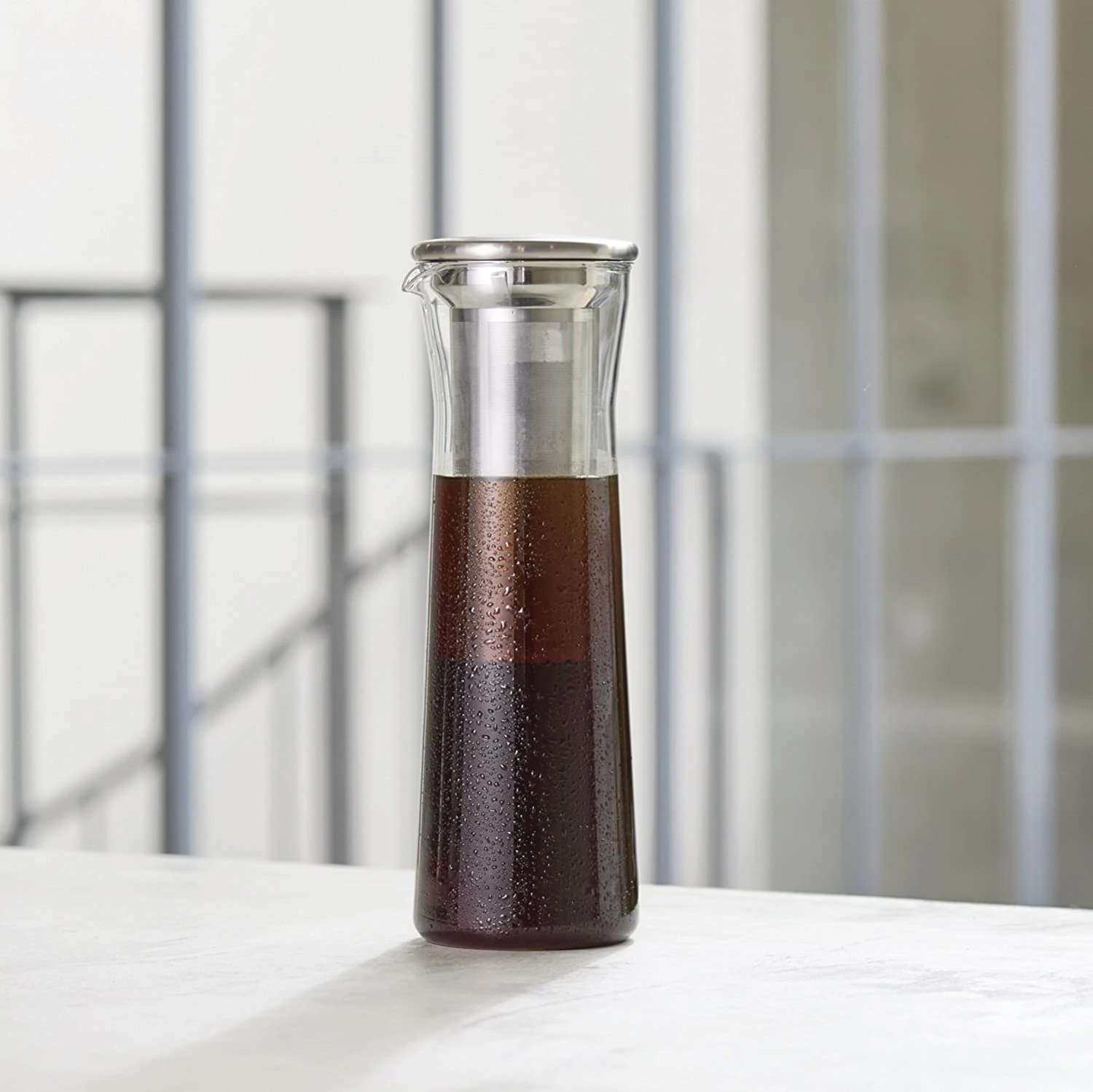 Make café-quality cold brewed coffee at home. The Cold Brew Coffee Jug easily brews, stores and serves chilled coffee. Simply place coarse ground coffee in the stainless-steel strainer, slowly pour cold water into the carafe through the coffee grounds and refrigerate for about 8 hours. For a cold coffee with more strength, increase steep time. The carafe is both beautiful for a counter top and sized to fit in a refrigerator door.
