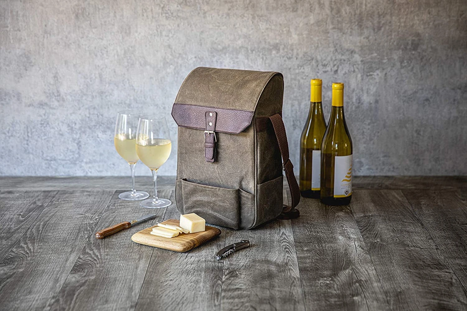 Made of waxed cotton canvas and soft, pebbled leatherette.; the bag has a removable interior divider and front pocket. Includes one stainless steel corkscrew, one stainless and wood cheese knife, and one acacia cheese board. Measures 9.8″W x 5.1″D x 13.6″H