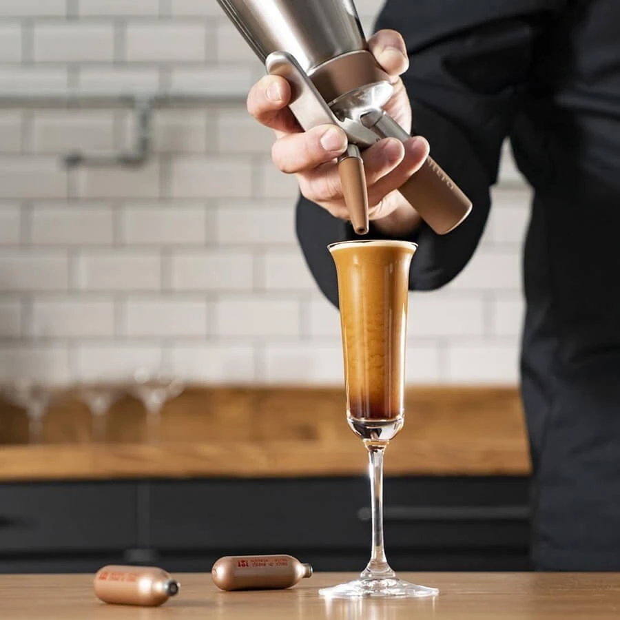The NEW no-hassle way to create perfect Nitro coffee, Nitro tea, and Nitro cocktails right at home! Adding Nitrogen (N2) to cold brew coffee and cocktails initiates a spectacular cascading effect, making the beverage unique, attractive, and personal. Nitrogen creates a velvety texture and a long-lasting foamy head for brews and cocktails. The iSi Nitro allows you to dispense fresh for every serving and the closed system allows the brew to remain unchanged for several days in refrigeration.