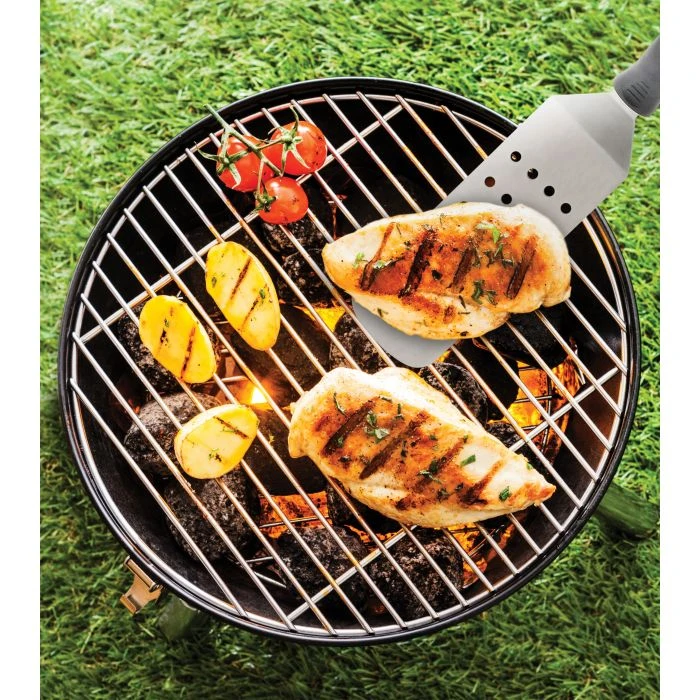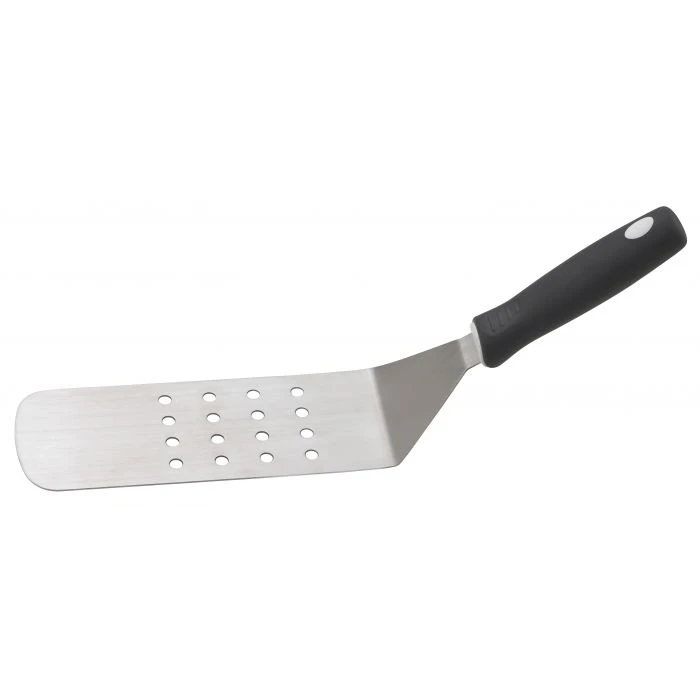 The World’s Greatest Flippin’ Good Burger Turner easily lifts and turns hamburger patties and other foods in the pan or on the BBQ grill. Crafted from a single-piece of stainless steel without welded joints or stress points for uncompromised strength and durability, the super flexible blade slides under food easily for precision flipping. Perforations in the blade quickly drain away cooking fats and juices from foods for mess-free plating. A helpful addition to cooking tools, the easy-grip TPR handle is comfortable during use then hangs conveniently nearby on a tool rack or stows away in a gadget drawer. Ideal for indoor and outdoor entertaining, it’s perfect for at-home and professional chefs, grillaholics, and all-day breakfast enthusiasts. Easily flip, divide, and serve generous portions of burgers, chicken patties, turkey burgers, rings of sausage, crab cakes, veggie burgers, steaks, grilled sandwiches, pancakes and eggs, hash browns, and more. Safe for use in steel pans and on the barbecue grill. Not intended for use with non-stick cookware.