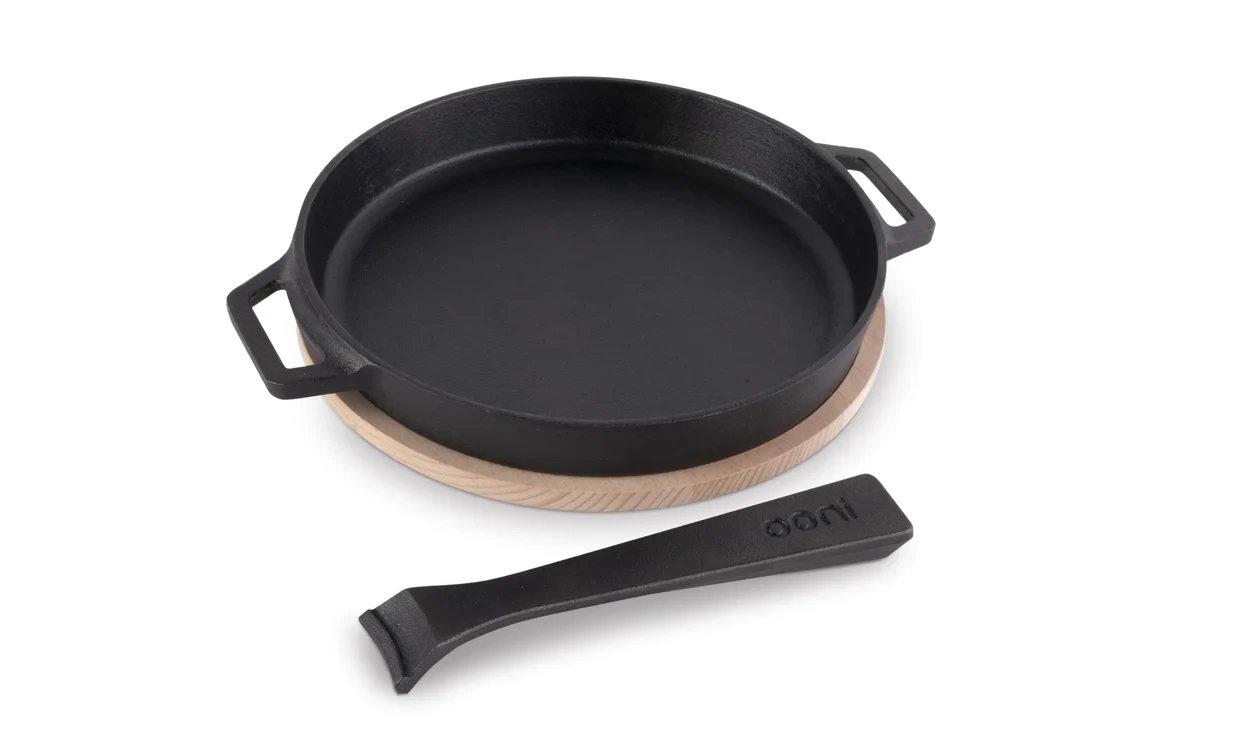 Our premium cast iron Ooni Skillet is perfect for cooking meat, seafood, vegetables and much more in your Ooni pizza oven. The Ooni Skillet comes with a custom-designed removable cast iron handle making it easy to get sizzling hot food straight from your oven to the table, and a sustainably sourced wooden board for serving.Â