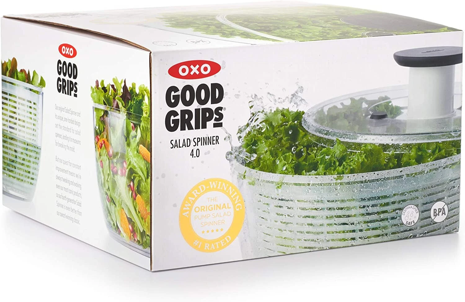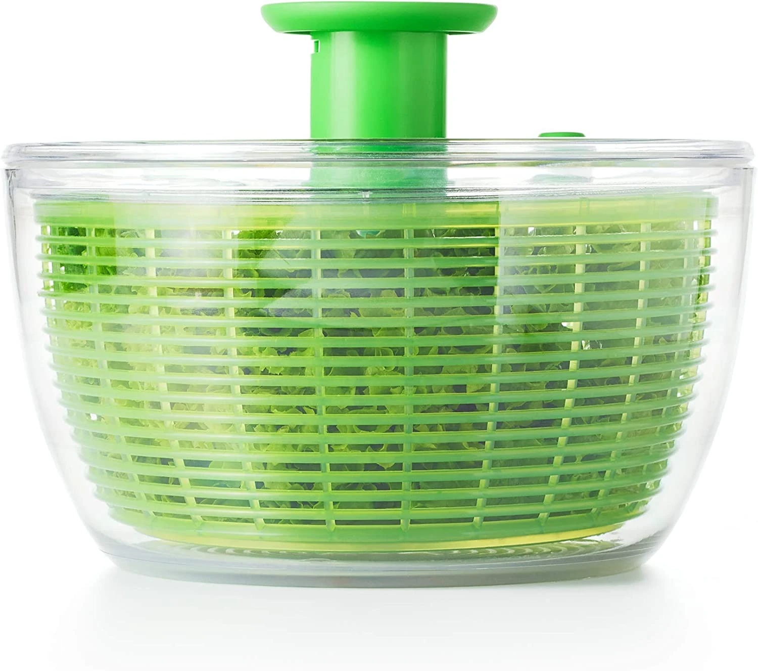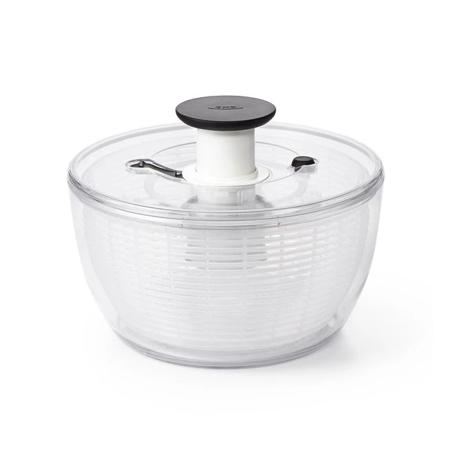 Dry salad greens with a simple press of the soft, non-slip knob. The non-slip base keeps the bowl steady on the countertop and the built-in brake button stops the Salad Spinner for unloading. The basket doubles as a colander, and the lid comes apart for easy cleaning. Selected as one of People Magazine’s 2017 50 Food Faves.