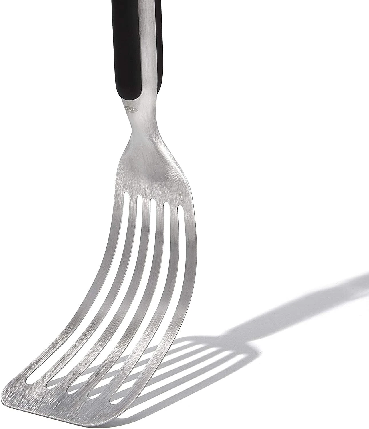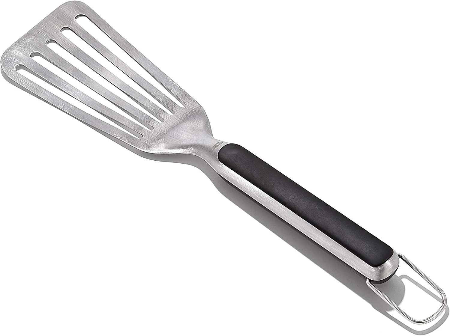 A flexible grilling spatula worth flipping over! The OXO Good Grips Grilling Precision Turner may look a lot like a fish spatula, and at its core, it is. But we’ve given it a different name because it’s good for so much more. Yes, the thin, beveled edge can slide seamlessly under the flakiest fillet. But the bendy, stainless steel head is also sturdy enough to hold the thickest pork chop. And with a comfortable, non-slip grip, plus a convenient hanging ring for grill-side storage, this spatula has it all. Dishwasher safe.