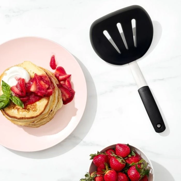 Our Silicone Flexible Turners combine the strength of stainless steel with the heat resistance and non-stick friendliness of a silicone outer layer. Thin, flexible edges glide under foods in the pan to keep them intact. The Pancake Turner easily flips pancakes, burgers and more.