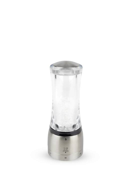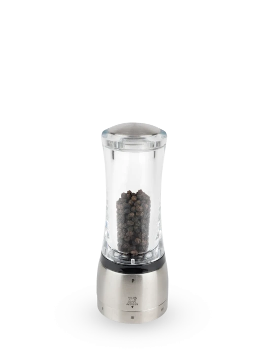 The Peugeot Daman mill is an example of beauty and modernity. Its pure-lined design features material effects that combine the transparency of acrylic with the unique radiance of stainless steel. This pepper mill incorporates an ingenious innovation: removal of the vertical central axis for extremely easy filling, accessed via the magnetic cover located above the mill. The u’Select custom grind control system is used to vary seasoning and enjoyment by choosing a pepper grind size from the 6 possible options. As with all Peugeot mills, the steel grinding mechanism comes with a lifetime guarantee.