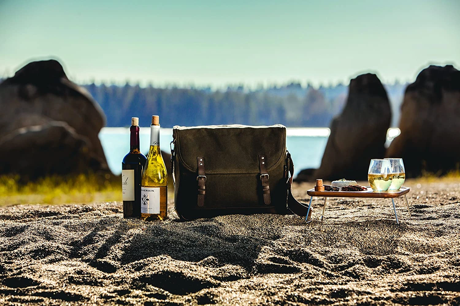 The Adventure Wine Tote is a dividable, insulated cooler with handsome khaki/brown waxed-cotton canvas, dark brown straps and buckles, and deluxe wine and cheese service for two. Set up the two shatter-resistant stemless wine glasses on the acacia wood folding table, open the wine with the wooden-handled dual leverage corkscrew, and make memories. The removable, adjustable shoulder strap also converts to backpack straps for easy transport.