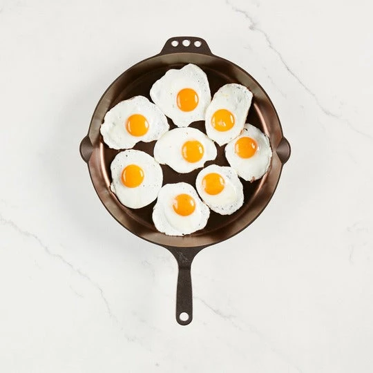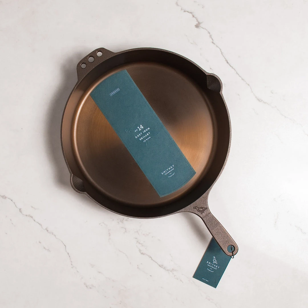The newest and largest addition to Smithey’s line of traditional skillets, the No. 14 knows no bounds when it comes to cooking for a crowd. Reflecting our iconic cast iron skillet design, the No. 14 has a larger surface area so you can go from searing multiple cuts of steak to sautéing a dinner’s worth of vegetables. This skillet is at home wherever there is heat. From oven to grill, or stovetop to campfire you can rest assured that this extra-large skillet will become your go-to vessel for large quantity cooking. Complete with Smithey’s signature polished interior finish, the No. 14 when seasoned is naturally non-stick and free of chemical coatings.