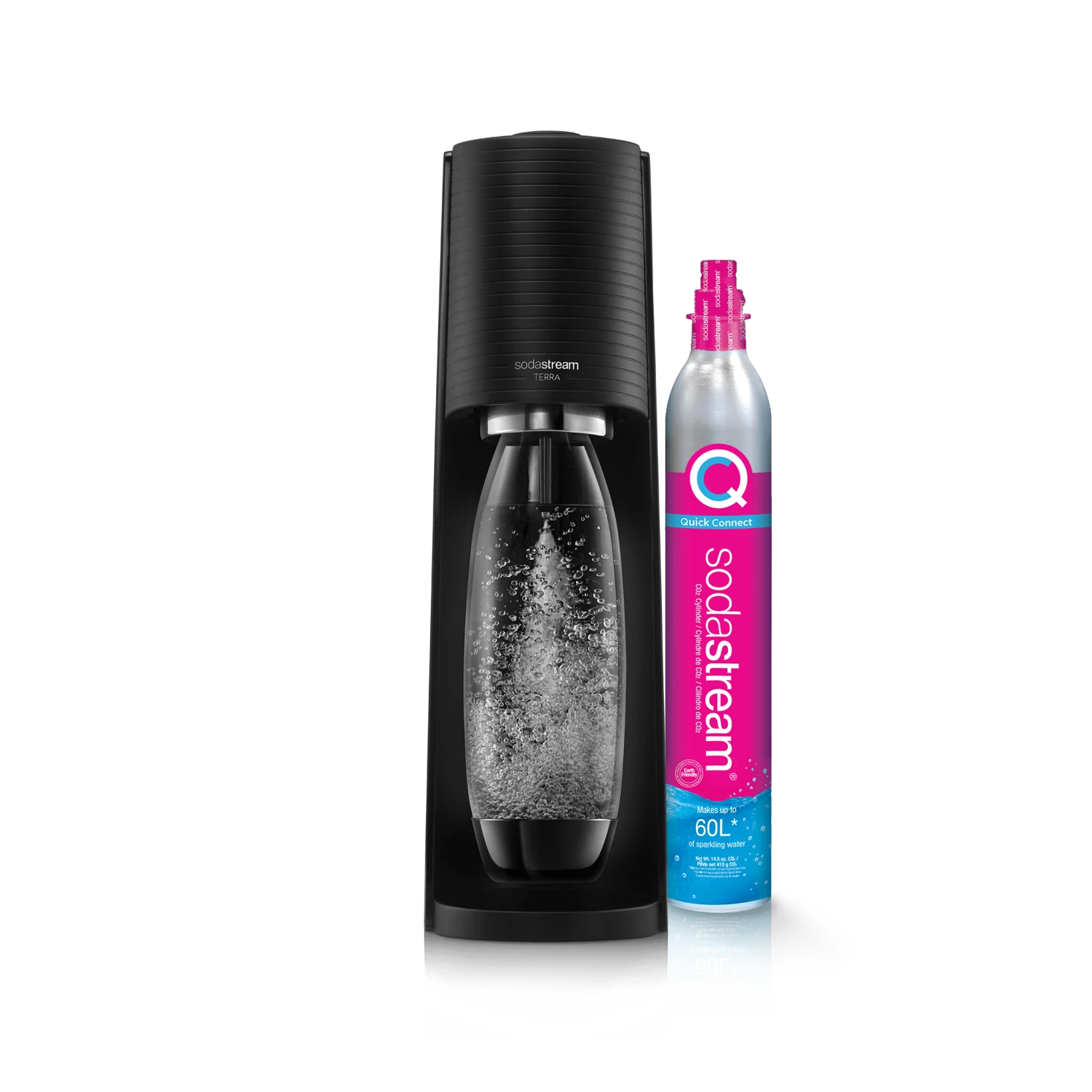 Introducing the Terra, SodaStream’s newest Sparkling Water Maker. Turn plain water into fresh sparkling water in seconds. Designed for the modern kitchen, it features the new Quick Connect technology for fast and easy CO2 cylinder insertion.