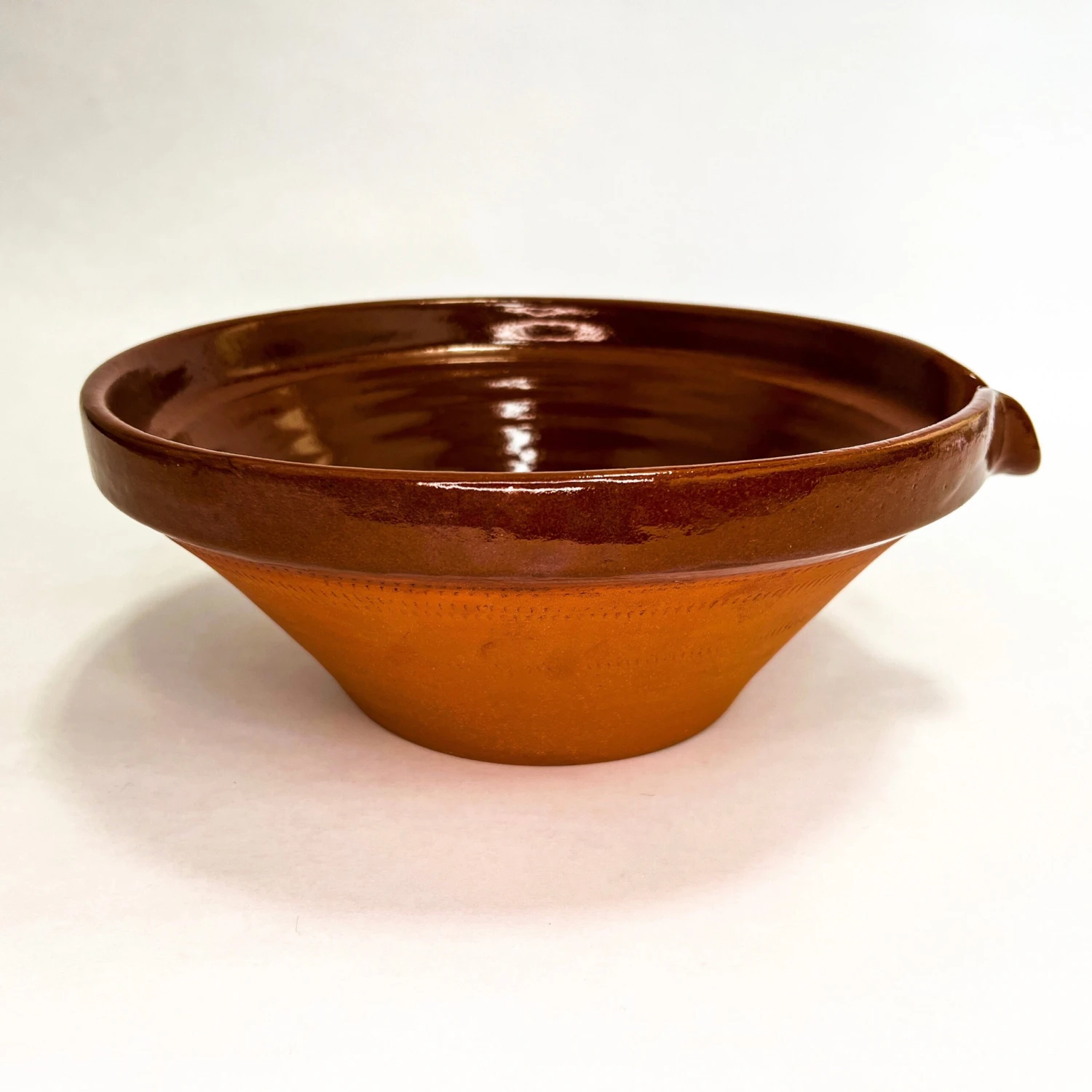 Welcome to the ancient technique of cooking with clay. This beautiful cassoulet bowl has an unglazed traditional terra cotta finish on the outside and a molasses-color glaze on the inside for easy cleaning. Designed with a pour spout for ease of use.