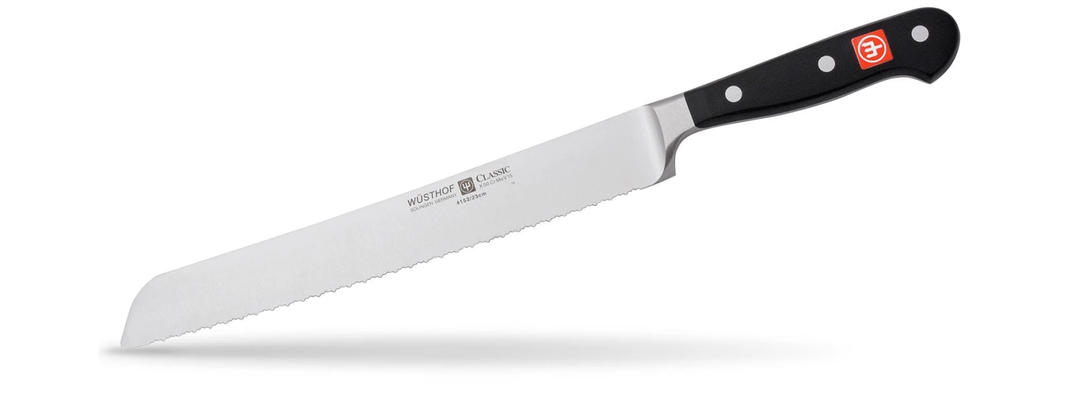 The CLASSIC 9″ Double Serrated Bread Knife has double the number of serrations or a serration within the serration. The design of the double serrated bread knife glides through crusty breads with minimal crumbs without damaging the inside. This knife can also be used on delicate produce or even angel food cake.