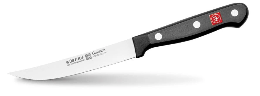 6 steak knives and 6-slot oak storage block Made of laser-cut high-carbon steel with stain-resistant alloy Synthetic polypropylene handles riveted for durability Precisely tapered blades.