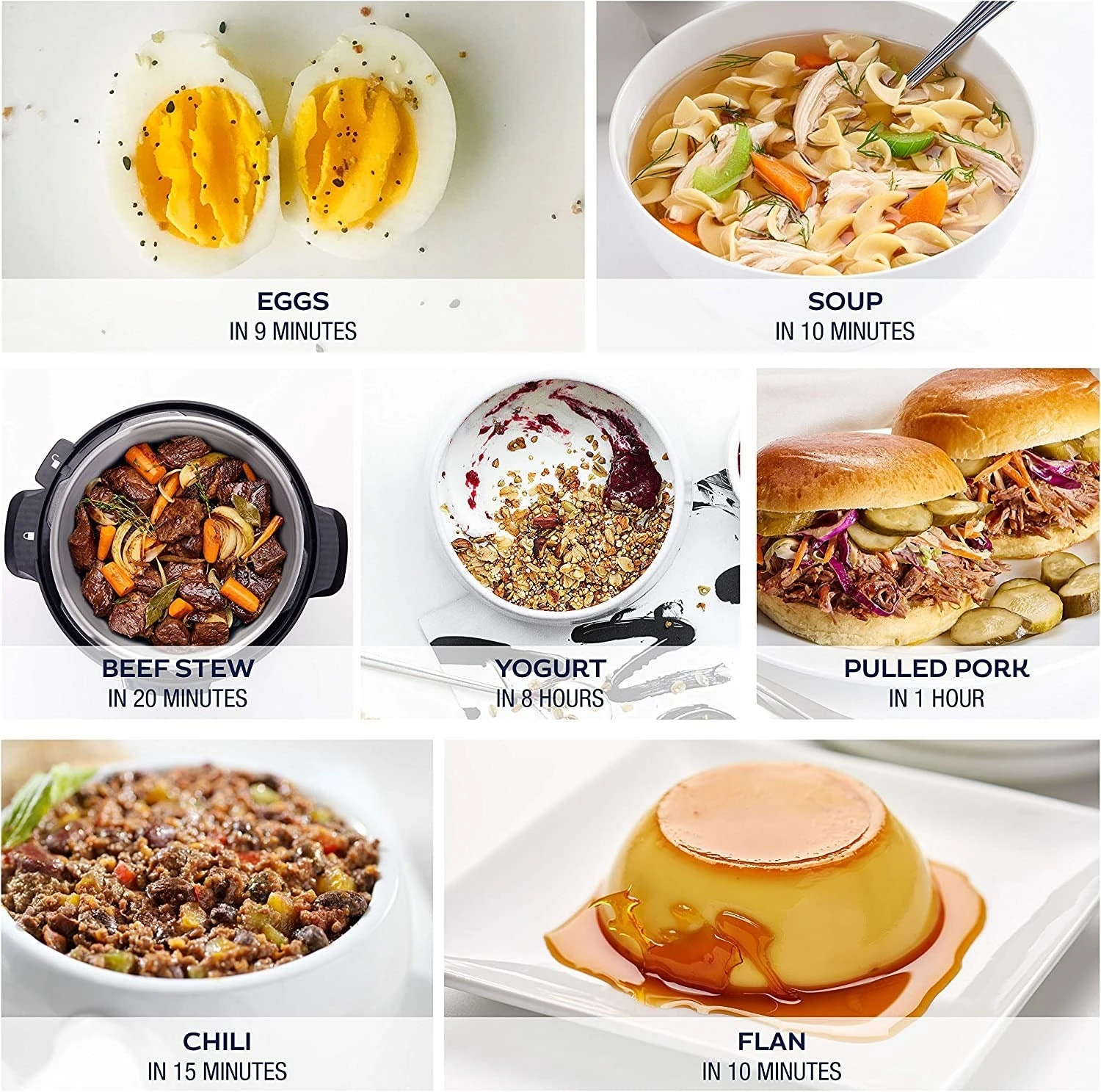 - Featured functions: pressure cook (High and low), slow cook (High and low), steam, brown, flex (that allows to sous vide), simmer, yogurt, grains, eggs, dessert, keep Warm and time delay to program cooking time at your convenience